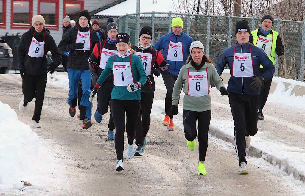 STARTEN: Bertine-Helene Færø (nr. 1), Grethe Jørgensen (9) og Trym Eknes (5) i teten ut frå start.